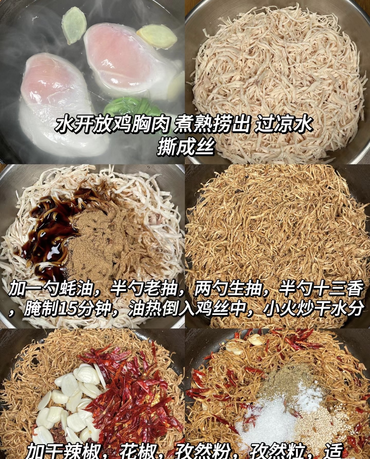 第二步,将鸡胸肉煮熟后撕成细丝,然后与调料混合在一起腌制一段时间。这个过程中,鸡丝会充分吸收调料的味道,变得更加美味可口。