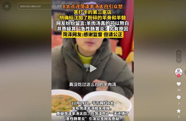 青岛新闻网《B太点评菏泽羊汤太白引众怒其打卡的第三家店明确标注加了粉碎的羊骨和羊髓网友纷纷留言:羊肉汤真的留婷泉传“急性肠胃炎”另有原因菏泽网友:感谢监督 但请公正》2024.12.16