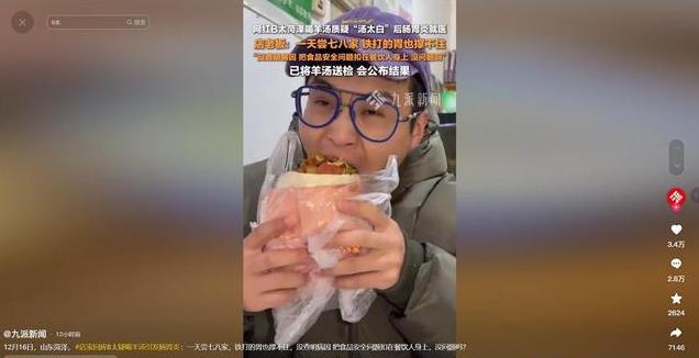 九派新闻12月16日山东菏泽,#店家回应B太疑喝羊汤引发肠胃炎:一天尝七八家,铁打的胃也撑不住,没查明病因 把食品安全问题扣在餐饮人身上,没问题吗?
