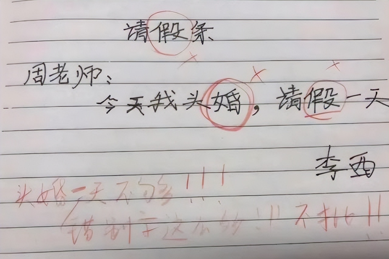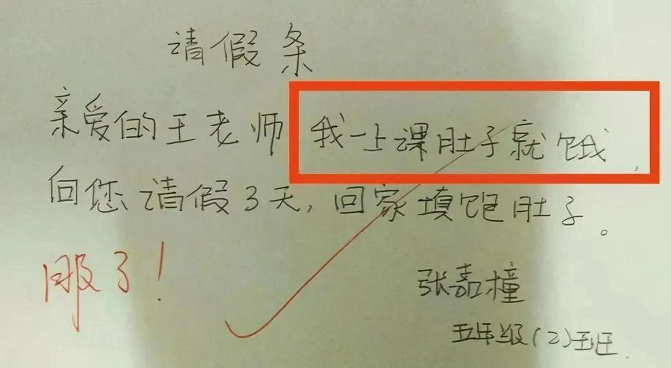 但你以为没有写错字的请假条,就能获得老师的批准了吗?另一名刘同学为了看邻居家刚生的小狗,想跟老师请一天假回去看看,还认真地表示:自己和狗狗一起玩了一年,有感情,想回去照顾一下狗妈妈。