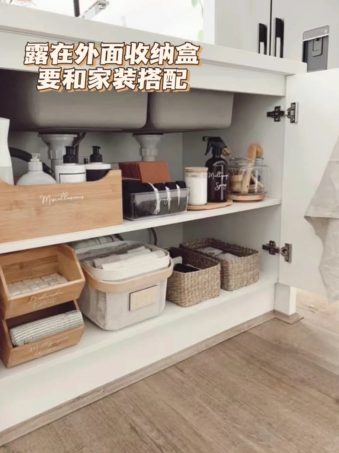 而且露在外面的收纳尽量实用的收纳工具统一规格大小一样,这样看起来会更加整齐,拿取也更方便。