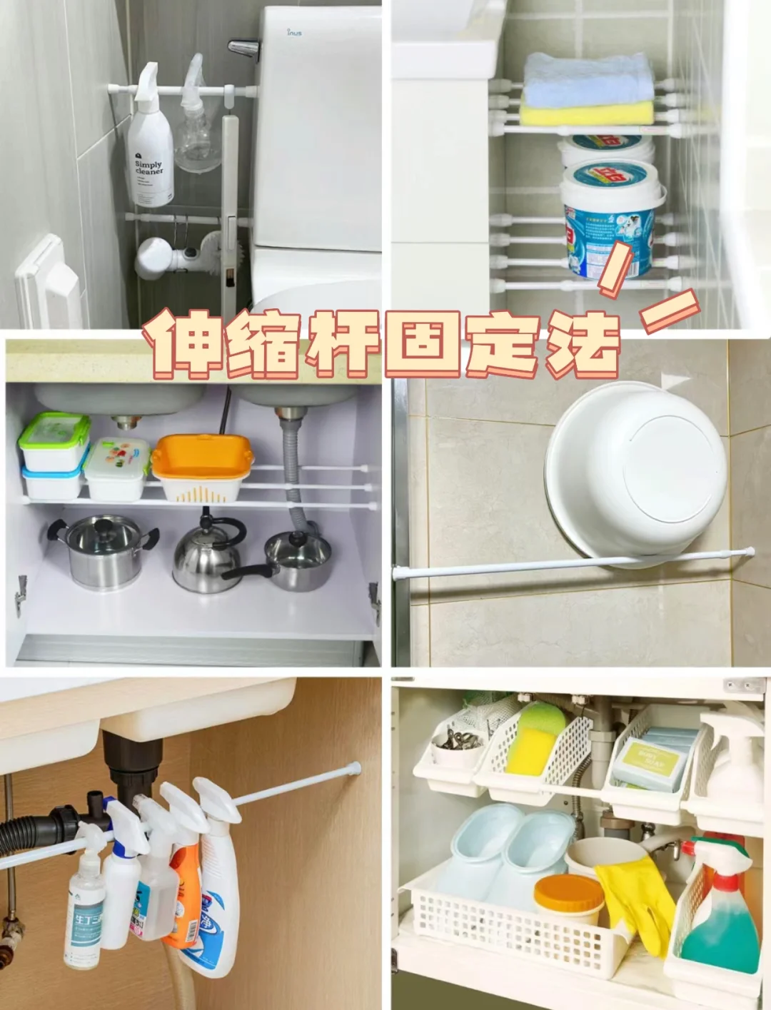 将伸缩杆的两头固定在柜子两侧,这样就增加了储物空间,有一些清洁用品可以直接悬挂在上面,也可以搭配收纳篮。