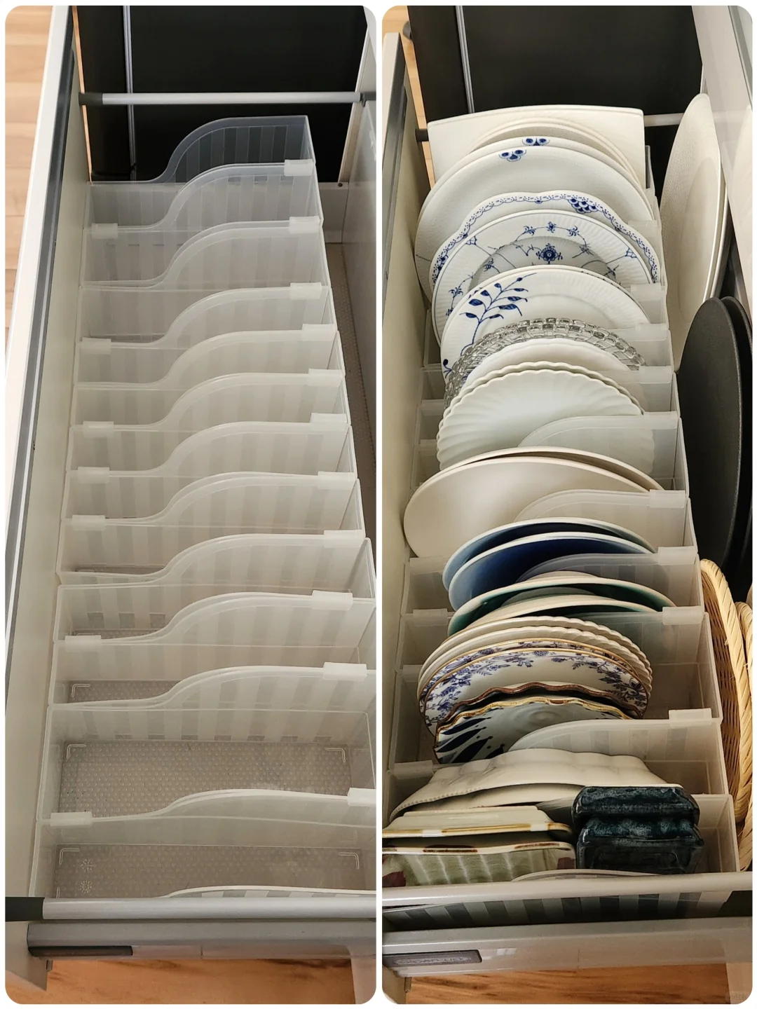 将盘子竖着收纳不占地方,而且可以离开水分保持盆内干燥,随用随取更加方便,而且这种收纳方式能收纳更多的餐具,整洁又美观。