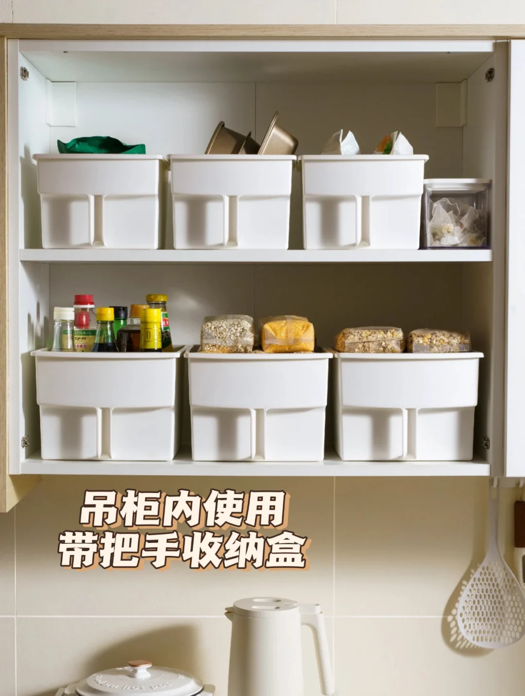 吊柜做最好做下拉收纳篮,这样收纳上面的物品比较好拿取,但是如果没有下拉收纳篮,要使用带把手的收纳盒,这样比较容易拿取。