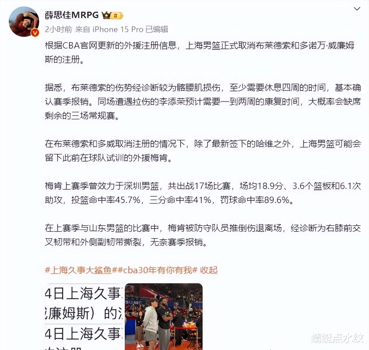 威廉姆斯,出场7次,场均6.9分,或许,他与球队的磨合,并没有达到预期。篮球场上,契合度有多重要,无需多言。这7场比赛,也成为了他上海久事生涯的全部。而布莱德索,31场比赛,场均13.6分4.9篮板9.3助攻,数据亮眼,却因髂腰肌撕裂,遗憾赛季报销。这突如其来的伤病,不仅让布莱德索告别赛场,也为上海久事男篮蒙上了一层阴影。更令人惋惜的是,国内球员李添荣和王哲林也遭遇重创,常规赛报销。这对于球队来说,无疑是雪上加霜。 这究竟是巧合,还是命运的捉弄? 一时间,上海久事男篮的阵容,显得有些单薄。