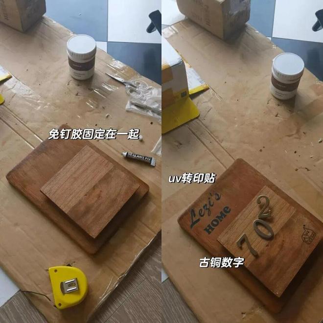3)用免钉胶将两块木板固定在一起,并做好相应的装饰,最后挂在入户门外的墙上就可以了。