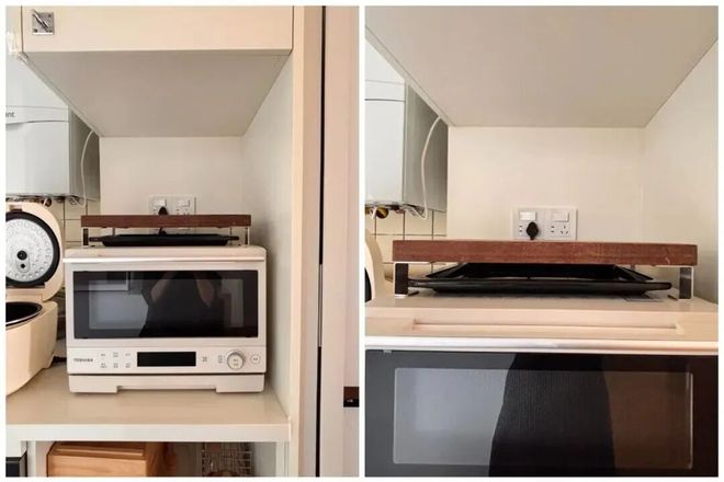 1)像烤箱、微波炉的上方,就可以采用“菜板+角码”的方式,做一个简单的置物架,进一步扩充收纳力。