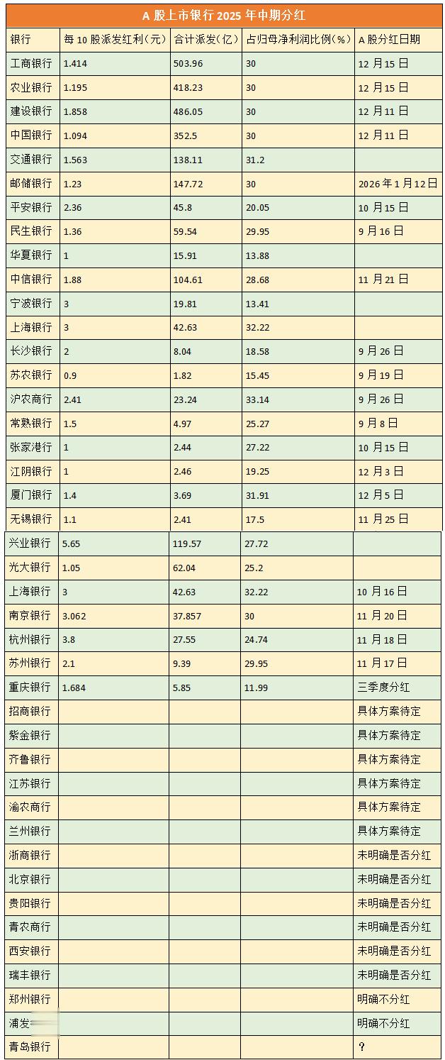其次是平安银行,2025年中期每10股分红2.36元,合计分红45.8亿,占归母净利润的20.05%,并在10月15日发放完毕。