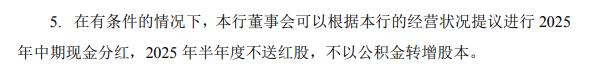 江苏银行半年报显示,该行2024年年度股东大会审议通过了2025年中期利润分配相关议案,具体方案将由董事会根据本行的盈利情况、现金流状况和中长期发展规划等决定,相关方案确定后将另行公告。