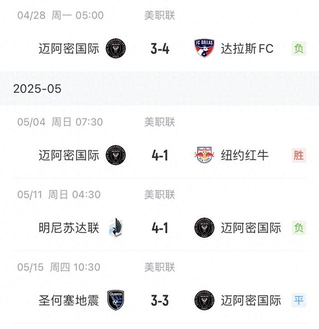直播吧05月15日讯 美职联常规赛,迈阿密国际与圣何塞地震3-3战平,迈阿密各项赛事近6场比赛仅1胜,此前中北美冠军杯也止步半决赛。