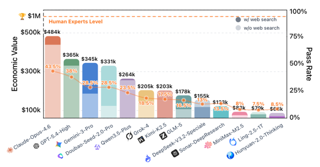 图1:$OneMillion-Bench模型表现和其获取的经济价值