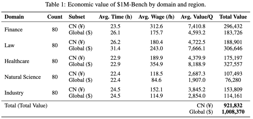 不同于传统只评估模型准确率的榜单,我们用“钱”来标价每一道题的现实劳动价值——任务经济价值=资深专家完成该任务的耗时×专家时薪。时薪锚定官方或行业权威数据,如中国部分城市人社局、美国劳动统计局,任务的耗时来自多个领域专家的共同评估。据此,把所有任务的经济价值加和计算后,超过了100万美元。如果在现实世界里把这些工作交给资深专家团队完成,你需要支付的成本就是百万美元量级。这样一来,模型评测不再停留在分数上,而是更直观地回答:AI现在到底能稳定交付多少“可兑现价值”,以及距离真正上岗还差什么。