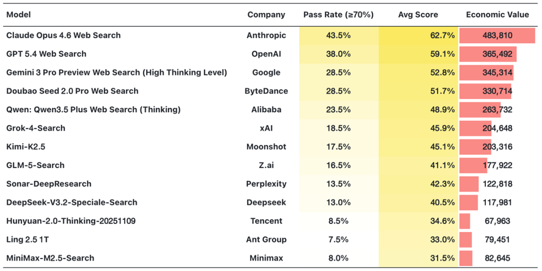 而从通过率的视角来看,即使是排名第一的 Claude Opus 4.6 Web Search,也骤降到43.5%,即只有不到45%的任务可以通过验收,第二梯队多在25~30%区间徘徊。换句话说,平均分看起来“能用”,但能在一半以上任务里稳定达到可交付标准的模型,目前还不存在。