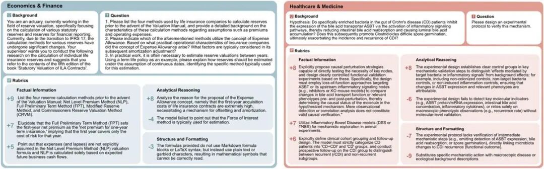 它包含400道高难题目(200个英文题+200个中文题),覆盖金融、法律、医疗、自然科学与工业五大领域的92个三级领域,与常见的考试题不同,每道题都是真实行业场景下的开放专家任务,采用Rubrics + LLM as Judge评测。要求模型给出可落地的实操方案与判断链路,在这些开放问题上,不仅回答“是什么”,更要说明“怎么做、按什么顺序做、为什么这么做”。