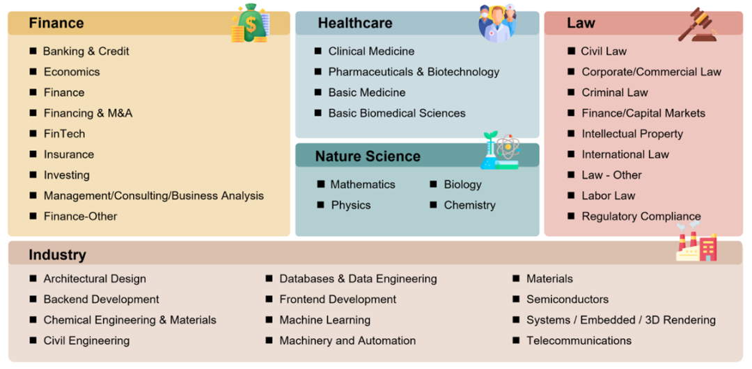图2:$OneMillion-Bench5个领域,37个二级和92个三级细分类别