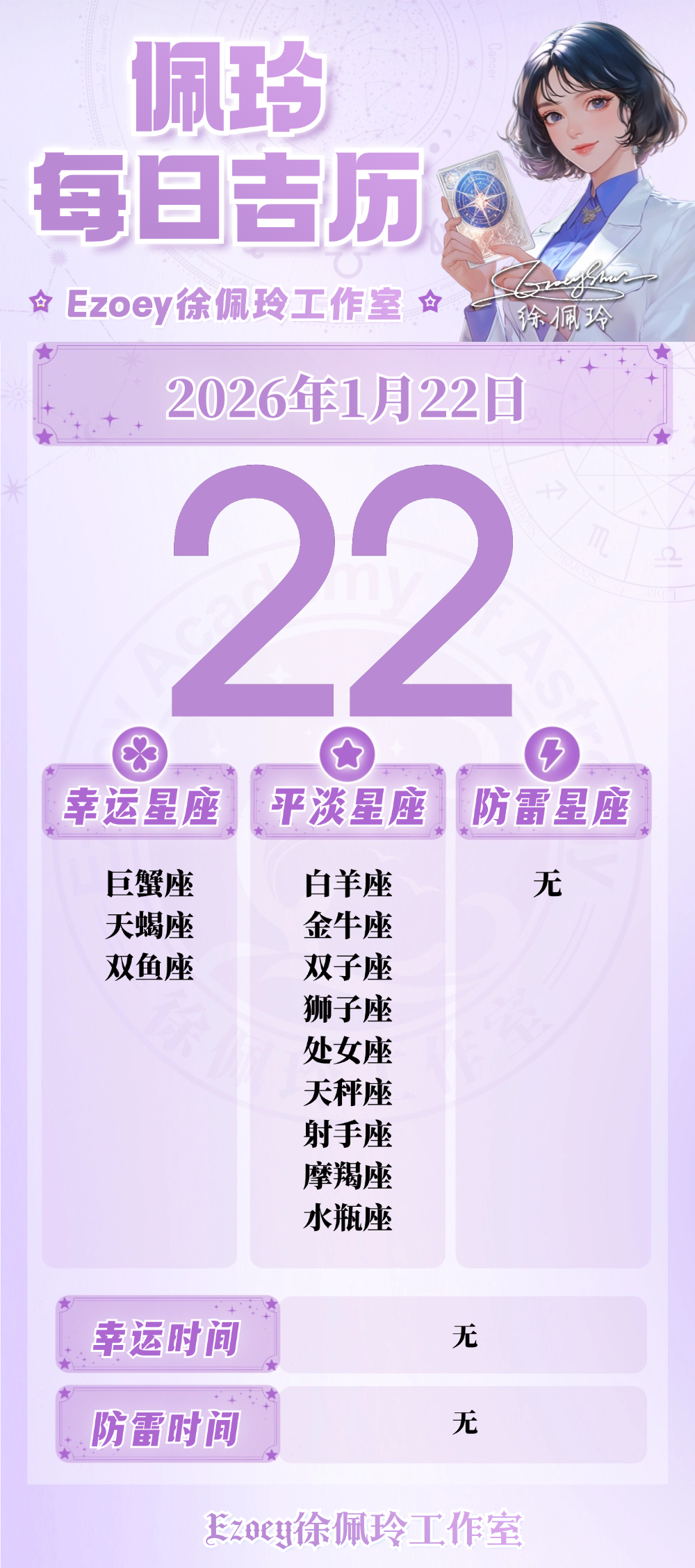 【1.22日播报】月亮在双鱼座行进 幸运星座:巨蟹座、天蝎座、双鱼座——Ezoey徐佩玲26年星座播报