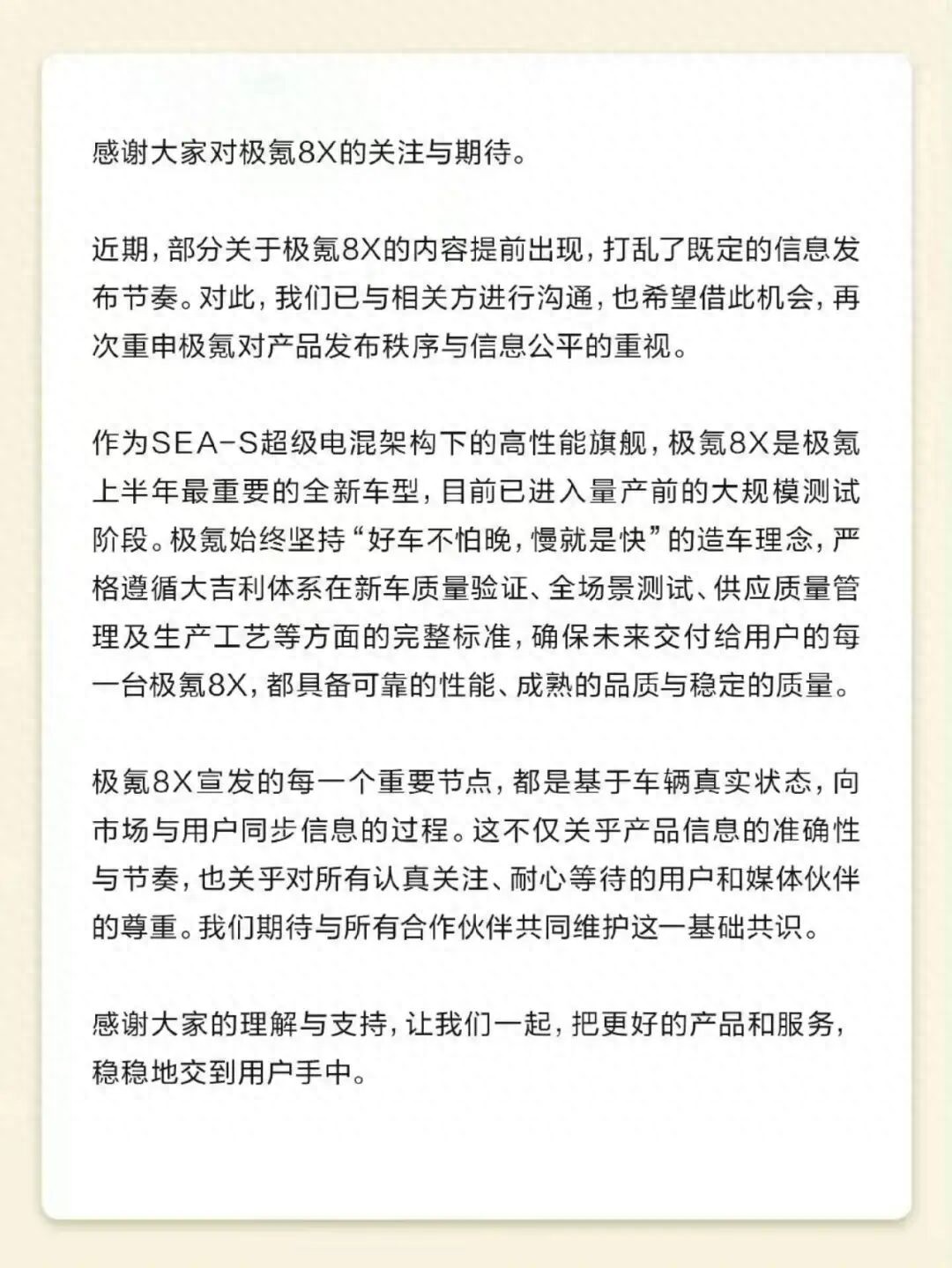 “极氪8X宣发的每一个重要节点,都是基于车辆真实状态,向市场与用户同步信息的过程。这不仅关乎产品信息的准确性与节奏,也关乎对所有认真关注、耐心等待的用户和媒体伙伴的尊重。我们期待与所有合作伙伴共同维护这一基础共识。”极氪方面表示。