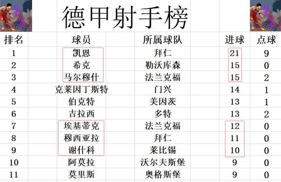 欧洲射手榜更新在射手榜上,凯恩今天虽然替补出场,但依然未能打破僵局,仍以21球稳居榜首。希克和马尔穆什则以15球并列第二。埃基蒂克今天依旧未能找到射门靴,仍然以12球排名第七。穆西亚拉以一记精彩的“一条龙”破门,将他的进球数提升至11球,位列第八。谢什科的进球让他本赛季的总进球数达到两位数,成为第九位达成此成就的球员。至于莫里斯、维尔茨和阿莫拉,则凭借各自9球的成绩,勉强挤进了前十名。