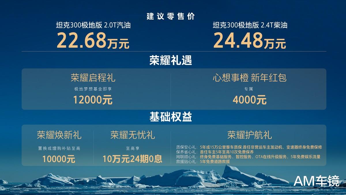 2025年12月11日,坦克300全球用户突破50万的节点上,极地版正式上市。售价分别是汽油版22.68万元,柴油版24.48万元,再加上实打实的购车礼遇,这波操作让不少越野迷直呼“诚意拉满”。
