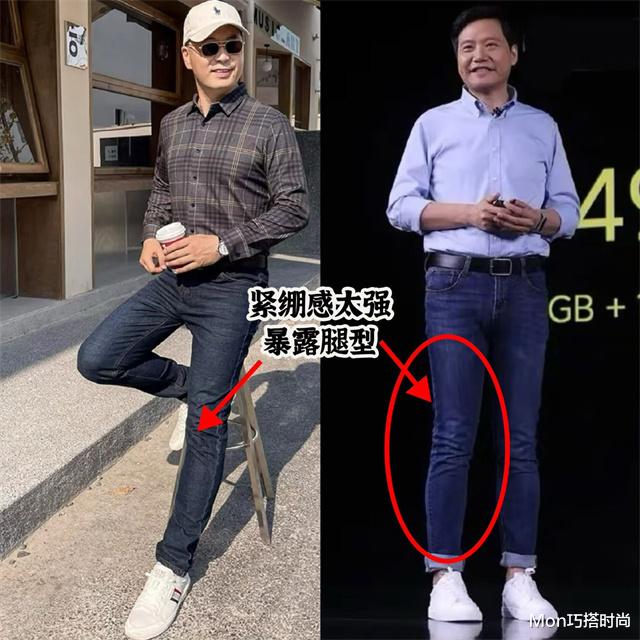 前面提到中年男人身材的变化,这就决定了紧身牛仔裤并不是一个好的选择。太紧身的牛仔裤会紧紧贴合身体曲线,将腿部的赘肉、变形的腿型等缺点暴露得一览无余,不仅影响美观,还会给人一种局促、不自在的感觉。