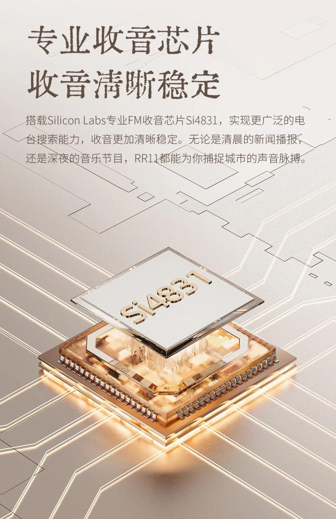 比如在收音机的性能上,RR11使用了专业的FM收音芯片Si4831,使其拥有更广泛的电台搜索能力,收音更加清晰稳定。