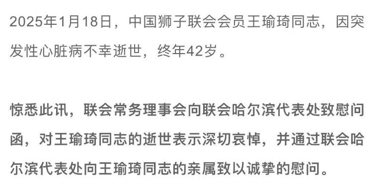 1月19日,中国狮子联会的官方账号更新一则讣告,该联会的会员王瑜琦不幸离世,将生命永远定格在42岁,去世原因是突发心脏病。