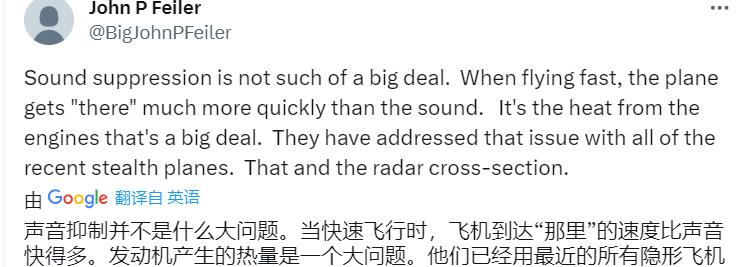 网友回应:声音抑制并不是什么大问题。当快速飞行时,飞机到达“那里”的速度比声音快得多。发动机产生的热量是一个大问题。他们已经用最近的所有隐形飞机解决了这个问题。那和雷达截面。