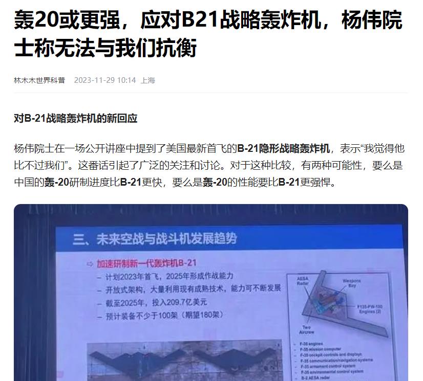 针对B21,我国专家也提出,美国最新的轰炸机技术不如中国的轰炸机20。