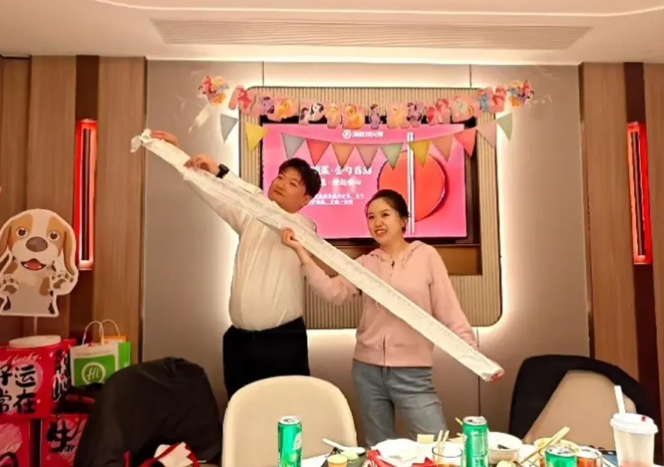海底捞员工也化身临时婚庆团队。扯面师傅用一米长的面条在新人头顶绕出爱心,变脸演员特意加了段《天仙配》。店长还搬出库存的140条红围巾,给每位宾客都系上"喜气"。