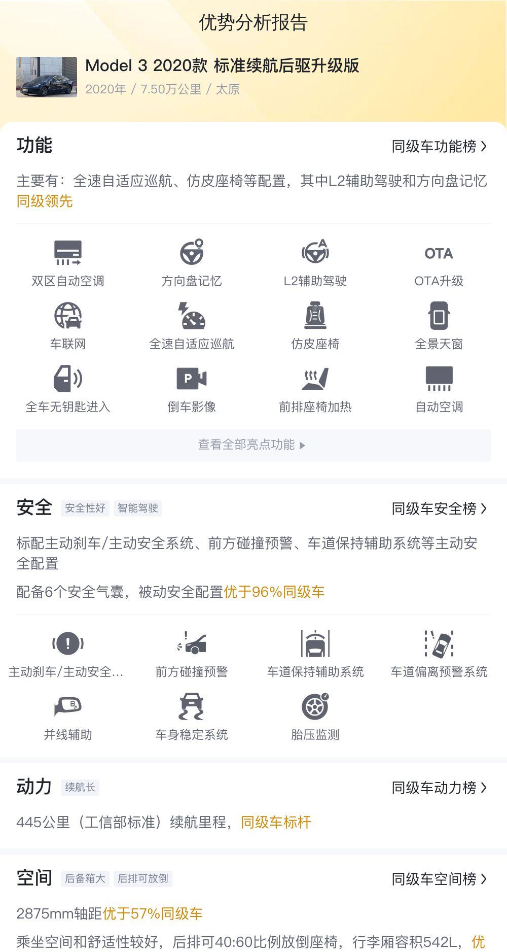 当然,这辆Model 3也并非一无是处。它配备了全速自适应巡航、仿皮座椅、L2辅助驾驶和方向盘记忆等功能,这些配置在同级别车型中还是比较有优势的。特别是L2辅助驾驶,可以提高驾驶的安全性,方向盘记忆也提升了驾驶的便利性。动力方面,202kW的最大功率和404N·m的最大扭矩,也保证了不错的驾驶体验。445公里的工信部纯电续航里程,对于日常通勤来说也足够了。