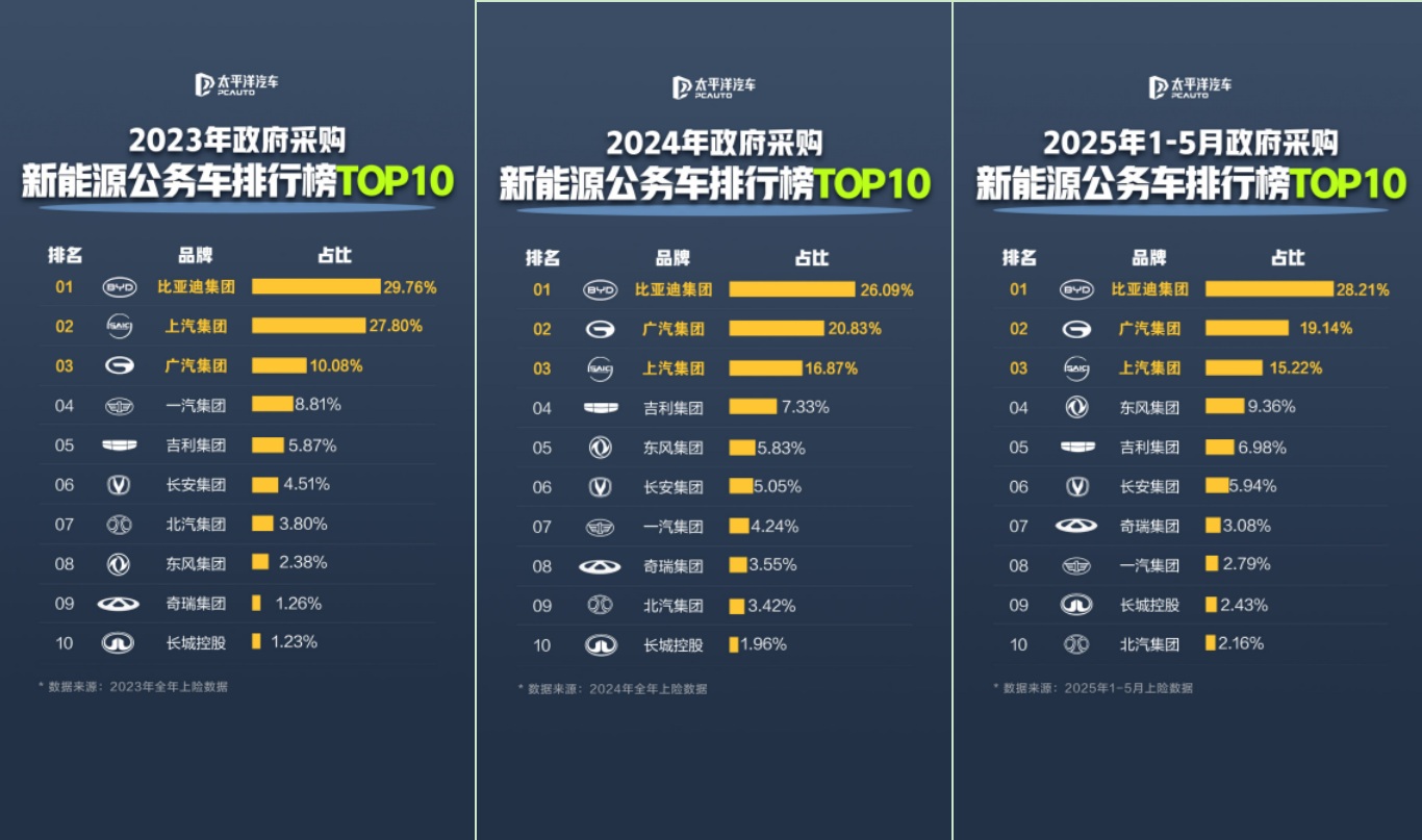 从榜单上可以看到,在政府采购新能源公务车中,比亚迪2023年销量占比为29.76%,2024年为26.09%,2025年1-5月则达到28.21%,连续三年都是位列榜首,占比均超过了25%,意味着,每4台新能源公务车中,就至少有1辆是比亚迪。