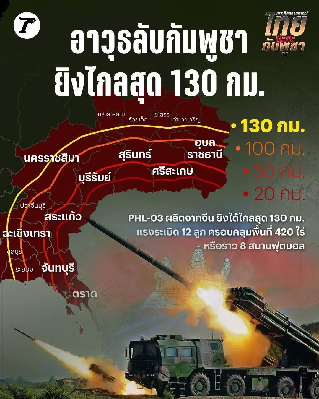 目前泰国军队,柬埔寨军队,都调动了大量中国制造的远程火箭炮,122mm火箭炮,除了中国制造的PHL‑03型300毫米远程火箭炮系统,出现在柬埔寨-泰国战场的,还有81式、90B、SR-4火箭炮,都是中国制造和出口的。泰军使用中国SR-4 122mm火箭炮(PHL-11外贸),对柬埔寨的BM-21冰雹火箭炮展开了反炮击。12月10日,柬埔寨当地人拍摄到,柬埔寨的13辆 81式火箭炮在路上,奔赴前线。柬埔寨士兵利用民众房屋,作为90B火箭炮发射阵地,向泰国四色菊府普马赫瓦发射90B型122毫米火箭炮。现在泰国军队与柬埔寨军队的战斗,炮击,更像是中械火箭炮的“内战”,接下来很可能会看到柬埔寨SH-1卡车炮大战泰国陆军的以色列造卡车炮。