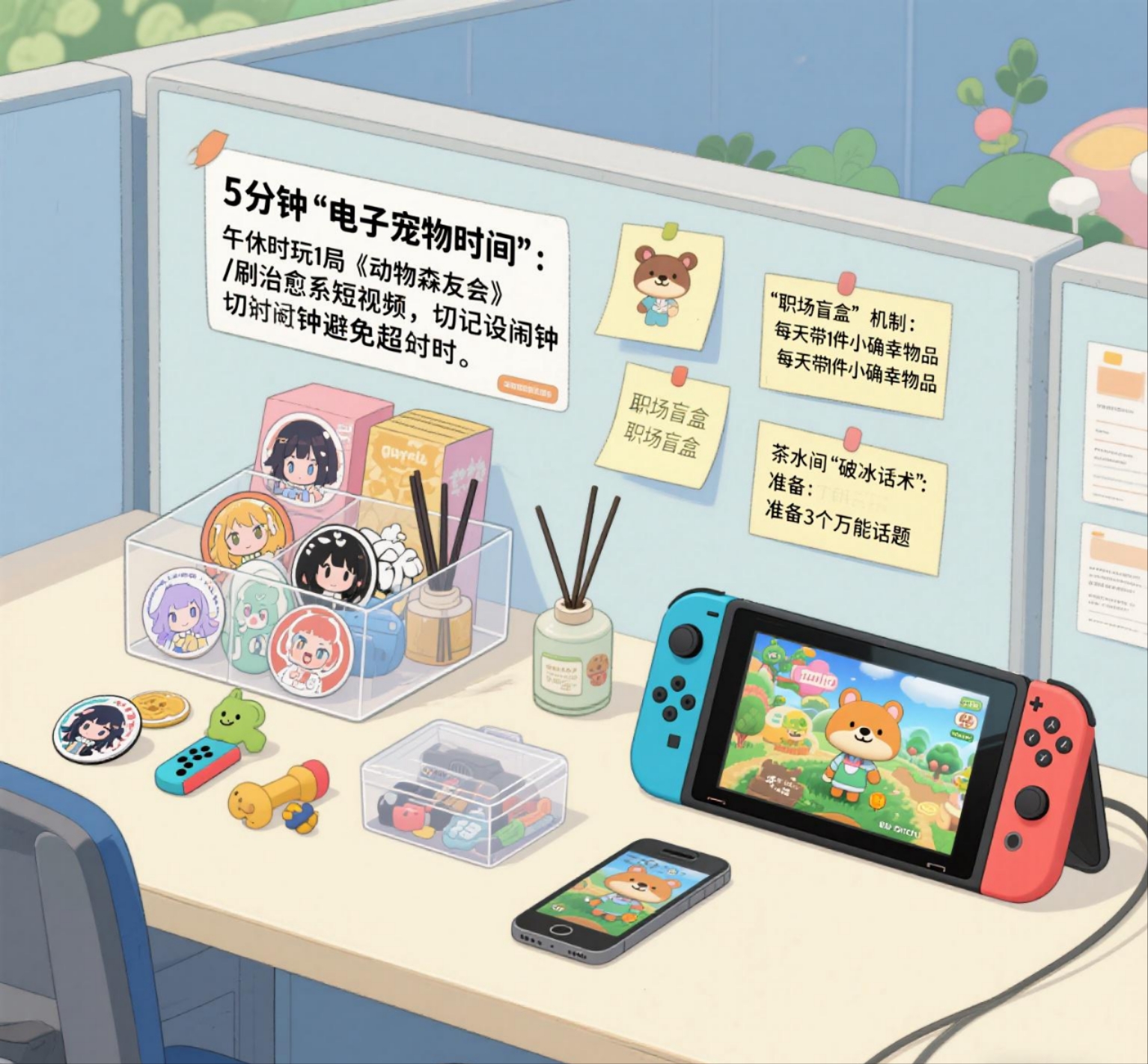 - “职场盲盒”机制:每天带1件小确幸物品(二次元徽章/香薰/解压玩具),心情低落时摸一摸;