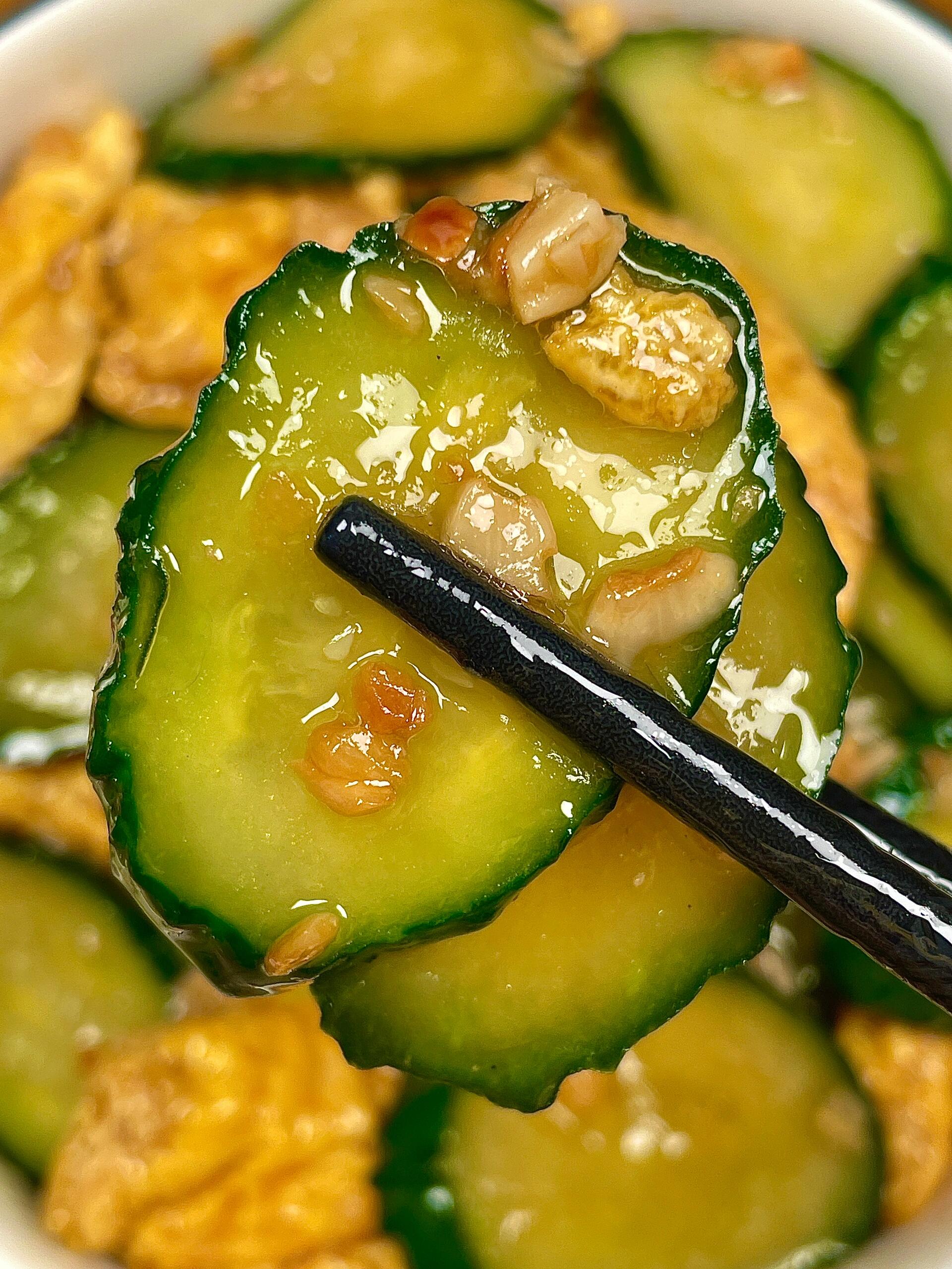 锅里再加一点点油,放入蒜末爆香,那股蒜香味一出来,整个厨房都香了!然后倒入切好的黄瓜片,大火快炒。这时候你会听到黄瓜和锅接触时发出的清脆声响,这就是好吃的声音!黄瓜炒个一分钟左右,看到边缘有点透明了,就把刚才炒好的鸡蛋倒回去。