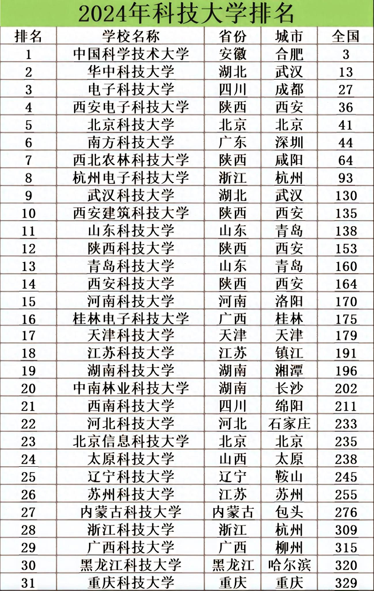 根据网友整理的数据,2024年全国的部分科技大学的排名如下表所示(该榜单不包含国防科技大学),你的大学排名第几?