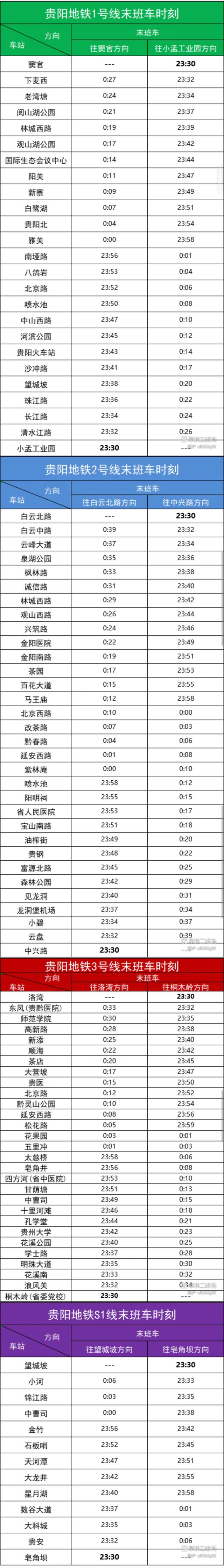 ️每周五、周六、周日:全线网(1、2、3、S1线)延长运营至23:30发车,运营服务时间调整为06:20-23:30。末班车发车时间见下表。