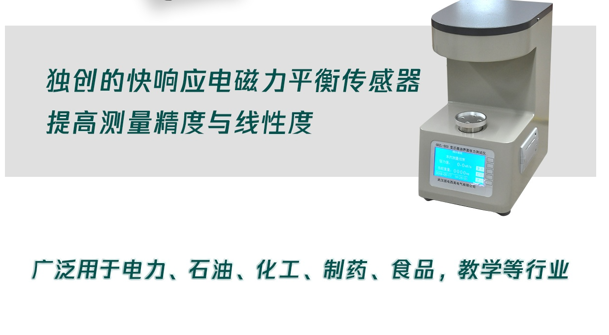 1. 产品性能:主打GDZL-503型全自动张力测定仪,严格遵循GB/T6541标准,基于铂金环法设计,可精准测量各种液体的表面张力与界面张力,广泛适配电力、石油、化工、教学等多个行业。采用快响应电磁力平衡传感器,大幅提升测量精度与线性度,仪器校准仅需标定一点,解决了传统传感器多点标定的复杂问题,免去调零与调满量程电位器,新手上手极易。同时集成温度探测电路,可对测试结果自动进行温度补偿,确保不同环境下的数据准确性,配备240×128点阵液晶显示屏与无标识按键,具备屏幕保护功能,操作便捷直观。