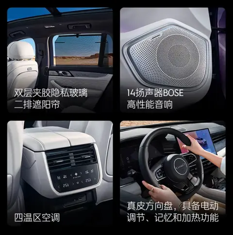车内配备双层静音隐私玻璃和遮阳帘,防晒效果良好,夏天阳光强烈时也不会刺眼,而且隔音效果不错,时速100km/h时,车内交谈不用提高音量,孩子在后排睡觉也不会被吵醒,不像有些车型,高速上噪音很大,长时间坐车会觉得烦躁。14扬声器的Bose定制音响音质表现不错,平时开车喜欢听音乐,这款音响的低音饱满,高音清晰,沉浸感很强,比我之前加装的音响效果还好。搭配海洋之谜香氛系统,能营造舒适车内氛围,有几种香型可以选择,我喜欢木质调的,闻起来很放松,缓解驾驶疲劳。三“0”健康座舱设计让新车内饰异味不明显,甲醛、苯等有害物质含量经检测远低于《乘用车内空气质量评价指南》标准,我老婆对气味敏感,提车的时候她就说几乎没什么异味,不用像有些车那样放很久活性炭,提车当天就能放心开。