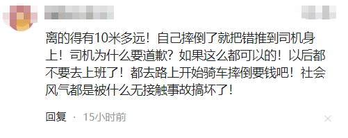 也有位网友认为离的得有10米多远!女子自己摔倒了就把错推到司机身上!司机为什么要道歉?如果这么都可以的!以后大家都不要去上班了!都去路上开始汽车摔倒要钱吧!社会风气都是被什么无接触事故搞坏了。