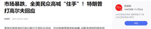 原文记载于京报网2025.04.06关于:市场暴跌,全美民众高喊“住手”!特朗普打高尔夫回应