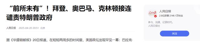 原文记载于人民日报2025.04.20关于:“前所未有”!拜登、奥巴马、克林顿接连谴责特朗普政府