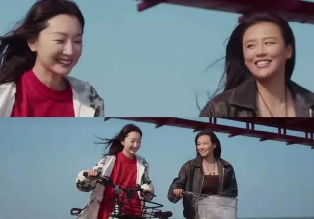 她状态极佳,与周冬雨再现电影《七月与安生》中的经典互动场景,在海边骑单车的画面,仿佛将观众拉回到了十年前那个充满青春气息的故事里。