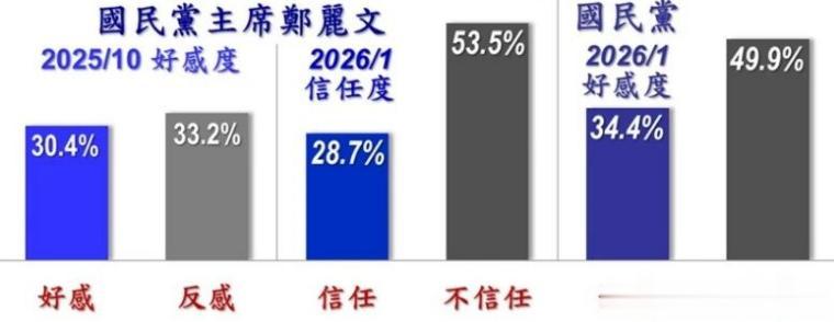 数据显示,现任国民党主席郑丽文的民众信任度只有28.7%,而不信任度高达53.5%。与之形成刺眼对比的是,赖清德信任度却达到了46.9%,不信任度稍低达到了43.3%,其支持率也回温到了其罢免风波前的水平。