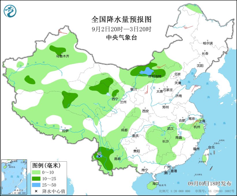 9月2日20时至3日20时,新疆南部和北部、内蒙古西部、西藏、西北地区中部、江南北部和西部、西南地区南部、海南岛等地将有小到中雨,其中内蒙古西部、云南西南部的部分地区有大雨。风力方面,新疆北部、内蒙古大部、陕西北部、山东半岛、浙江等地的部分地区将有4至5级风。