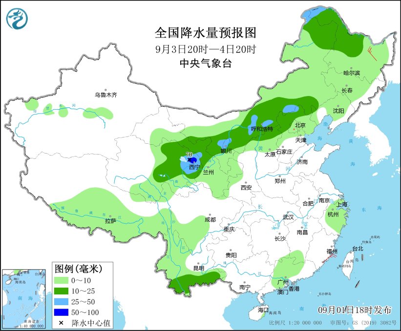 9月3日20时至4日20时,内蒙古东北部和中西部、黑龙江西北部、青海东部、甘肃中部、宁夏北部、山西北部、河北北部、云南南部等地将有中到大雨,其中青海东部部分地区将有暴雨。风力方面,新疆北部、内蒙古大部、东北地区西部和南部、宁夏、陕西北部、山西北部、浙江等地将有4至6级风。南海东北部海域的风力将达到7至9级,台湾海峡也将出现5至7级的风力。