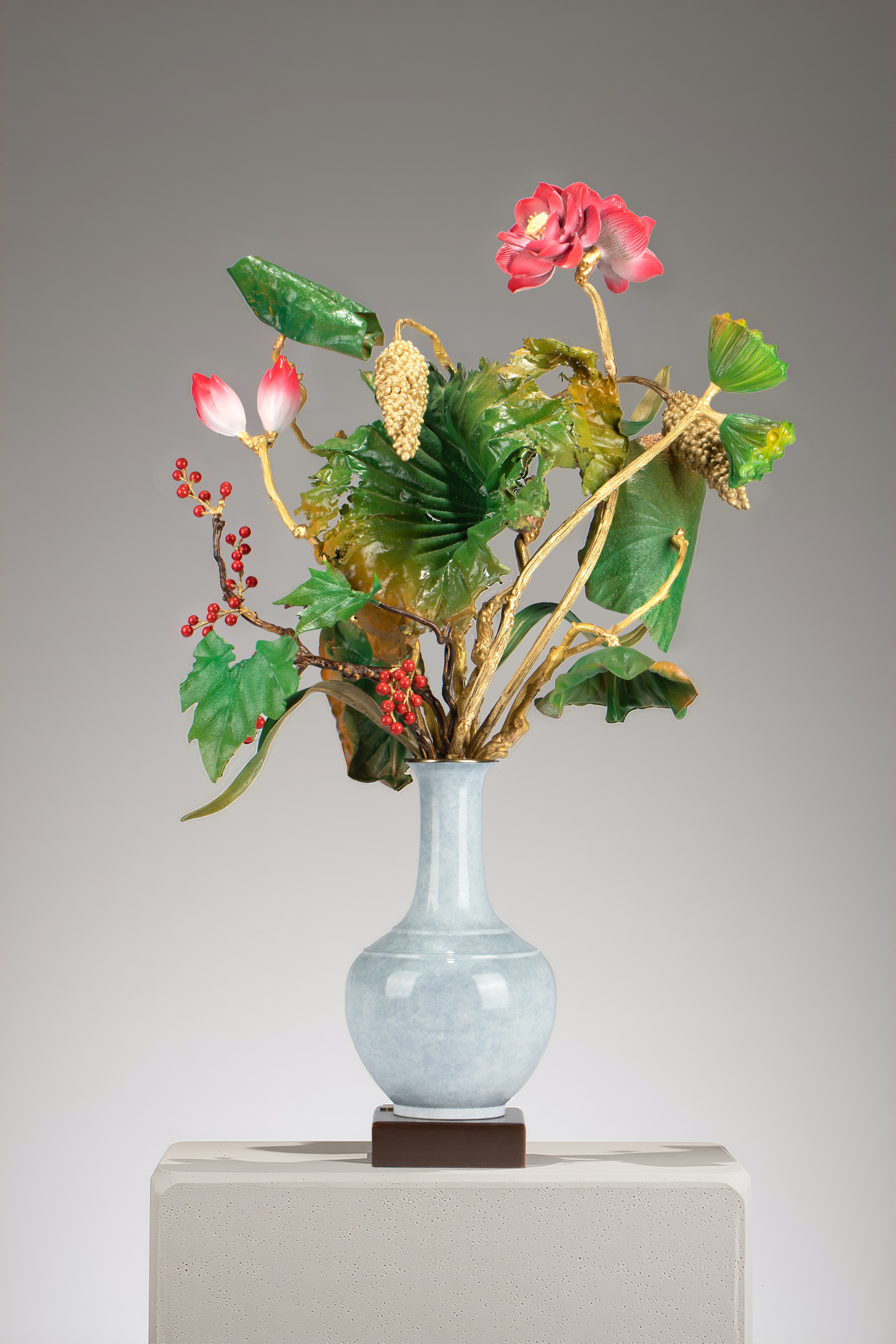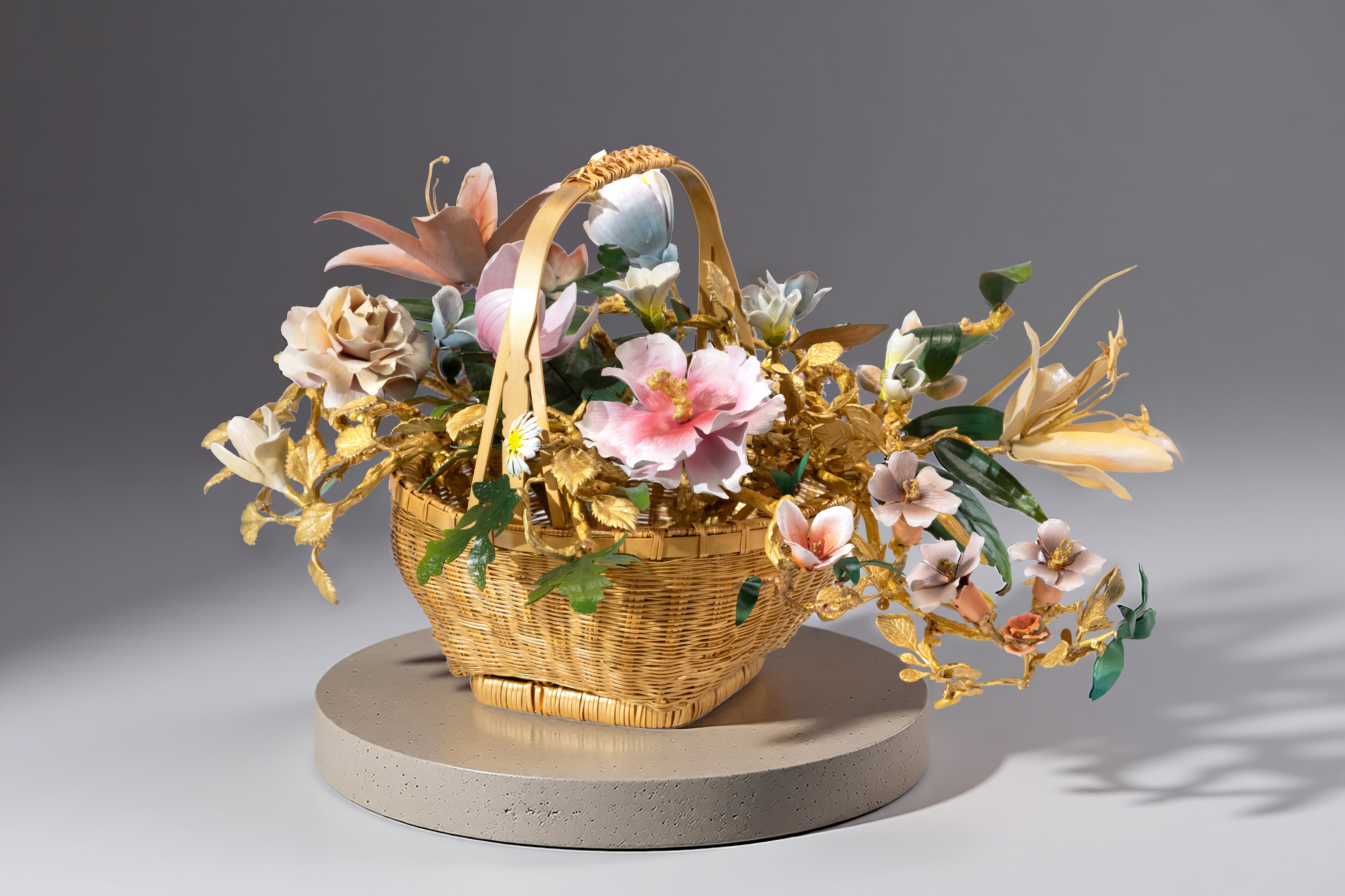 此次入藏的14件作品,全面展现了当代铜艺及其跨界艺术的多元风貌与巅峰成就。朱炳仁的10件作品涵盖熔铜、庚彩、铜壁画、云水墨与铜印等多种形式:《燃烧的向日葵》《国鹿》《千里江山》《千浪卷雪》以流动的熔铜肌理再现自然万象;庚彩《青花铜瓶》借鉴珐琅彩技法,让古铜焕发流光溢彩;铜壁画《万里长城》则延续其“中国铜壁画创始人”的艺术脉络;云水墨《鹅池》与熔铜山水铜印,展现了朱炳仁在书画与金石跨界领域的深厚造诣。朱军岷的4件熔铜清供《连年如意》《繁花似锦》《蕉石鹤寿》《万全如意》,将传统清供文化与熔铜工艺完美融合,为传统铜艺注入鲜活的当代审美活力。