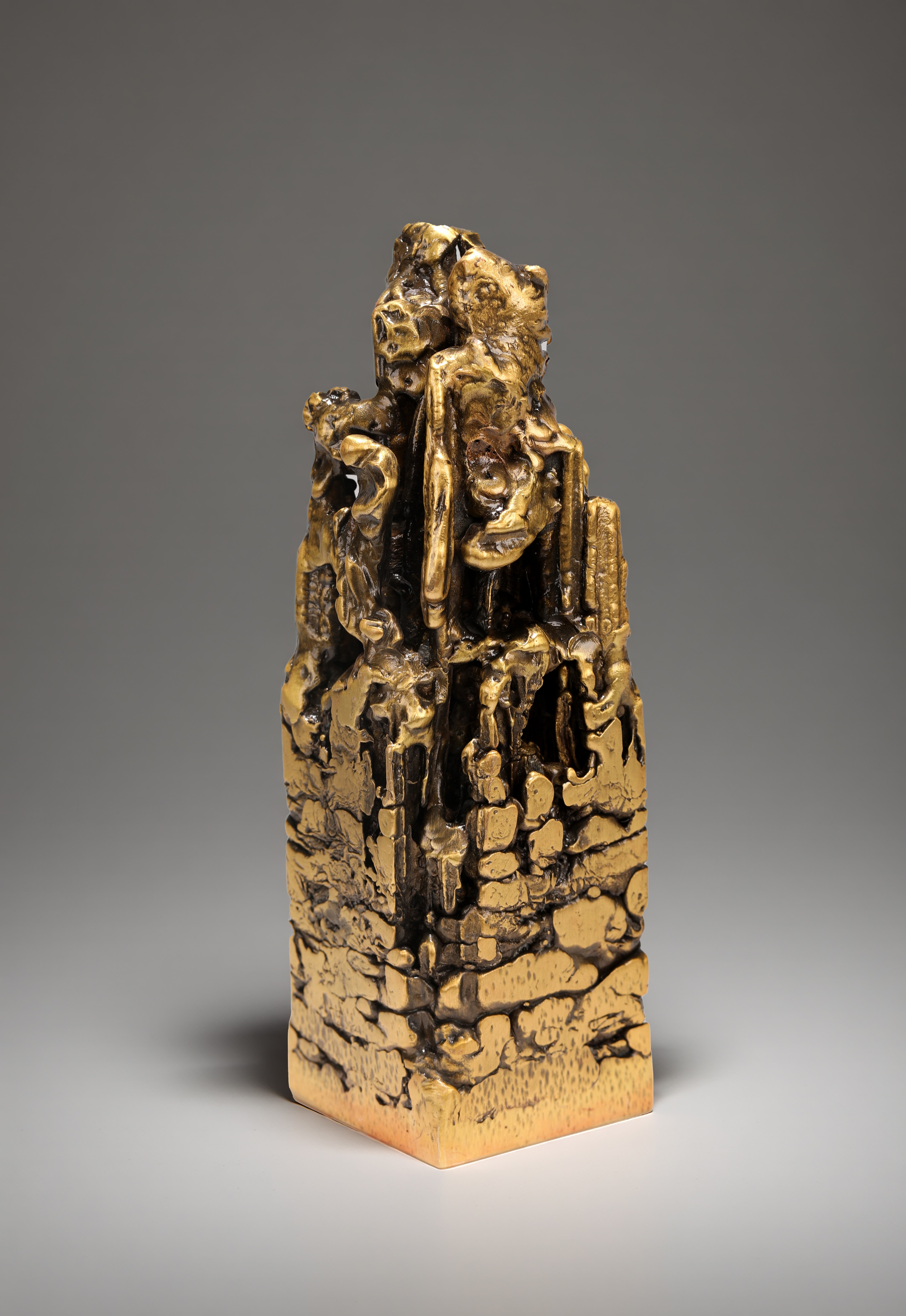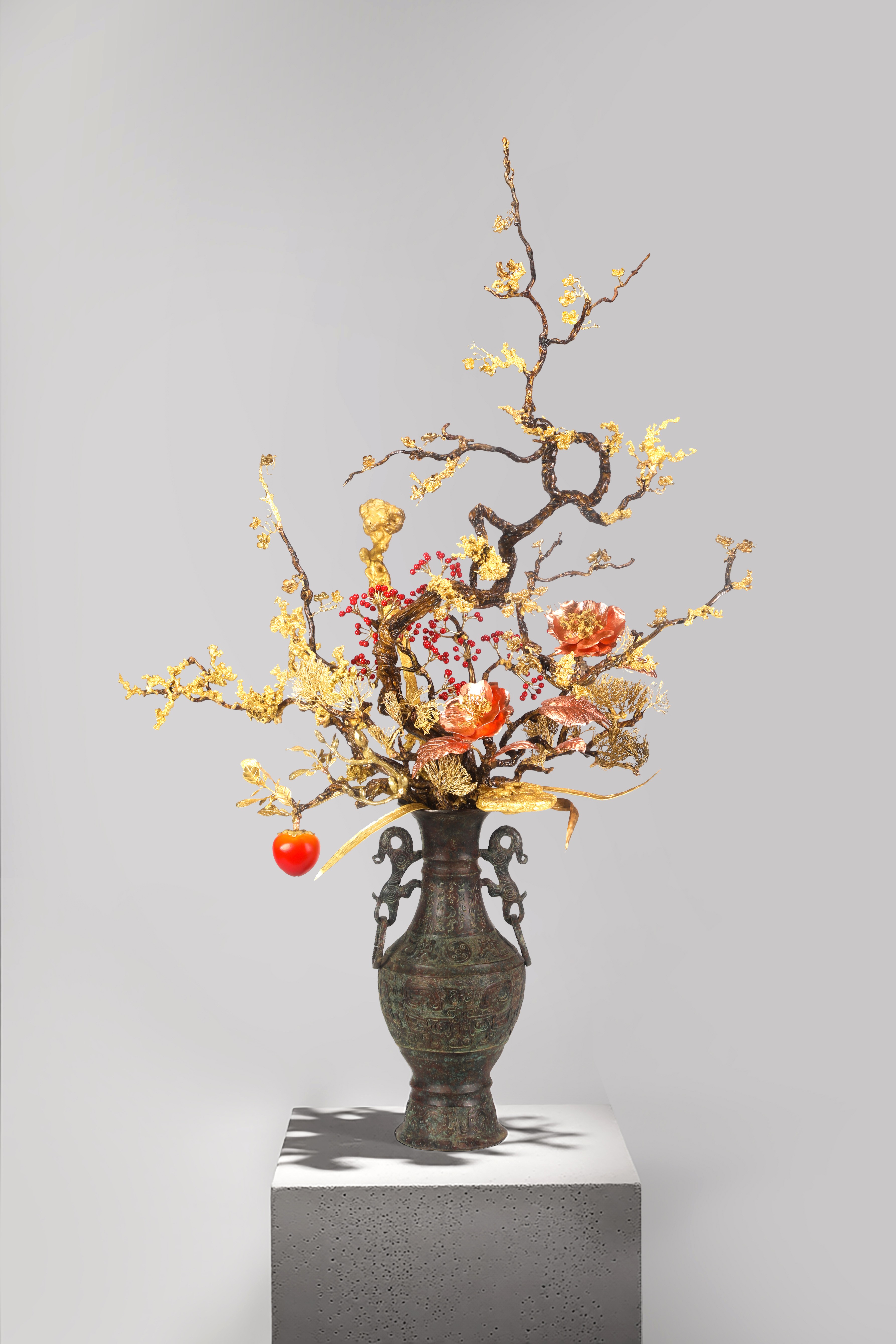 此次捐赠,朱炳仁、朱军岷父子二人首次实现同期批量入藏国博的创举。回溯2006年,常州天宁宝塔建造时的一场意外大火,让“中国当代铜建筑之父”朱炳仁敏锐捕捉到熔铜结晶体的天然美感,由此开创无模可控的“熔铜艺术”,打破了自青铜时代以来铜艺延续千年的铸模成型束缚。2007年,其首件熔铜作品《阙立》入藏国博,为这门新艺术叩开了国家最高历史文化艺术殿堂的大门。