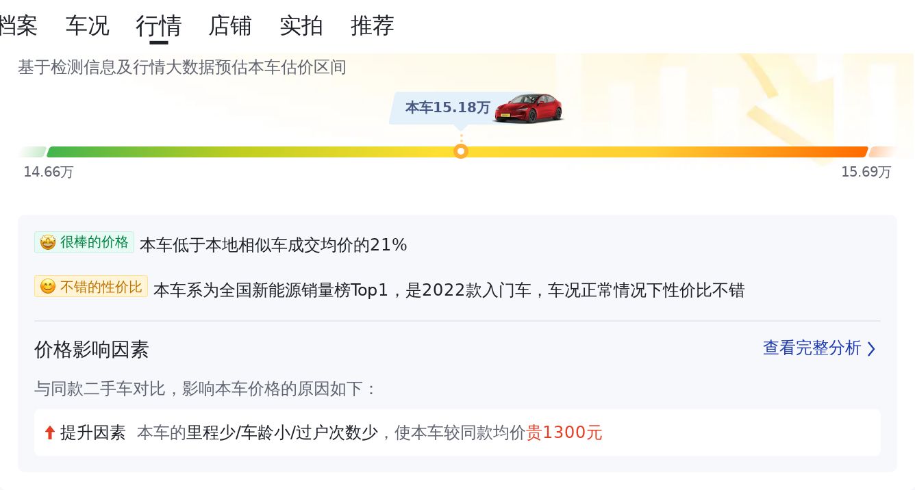 在价格影响因素部分,该车的价格受到了以下几个方面的共同作用:里程,少于均值0.1万公里,+100元,车龄,少于均值0.1年,+300元,过户次数,少于均值0.3次,+900元,颜色,黑色,0元。