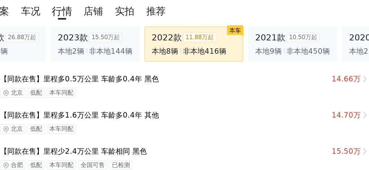 在市场行情部分,我们为您采集了一些相关数据,以便您更好地了解这款车的市场表现。目前,这款车型的二手车市场价位大致介于13.77万至16.41万之间。影响车辆价格的因素众多,包括车龄、里程和保养状况等,而具体的车况将是决定成交价的关键因素。