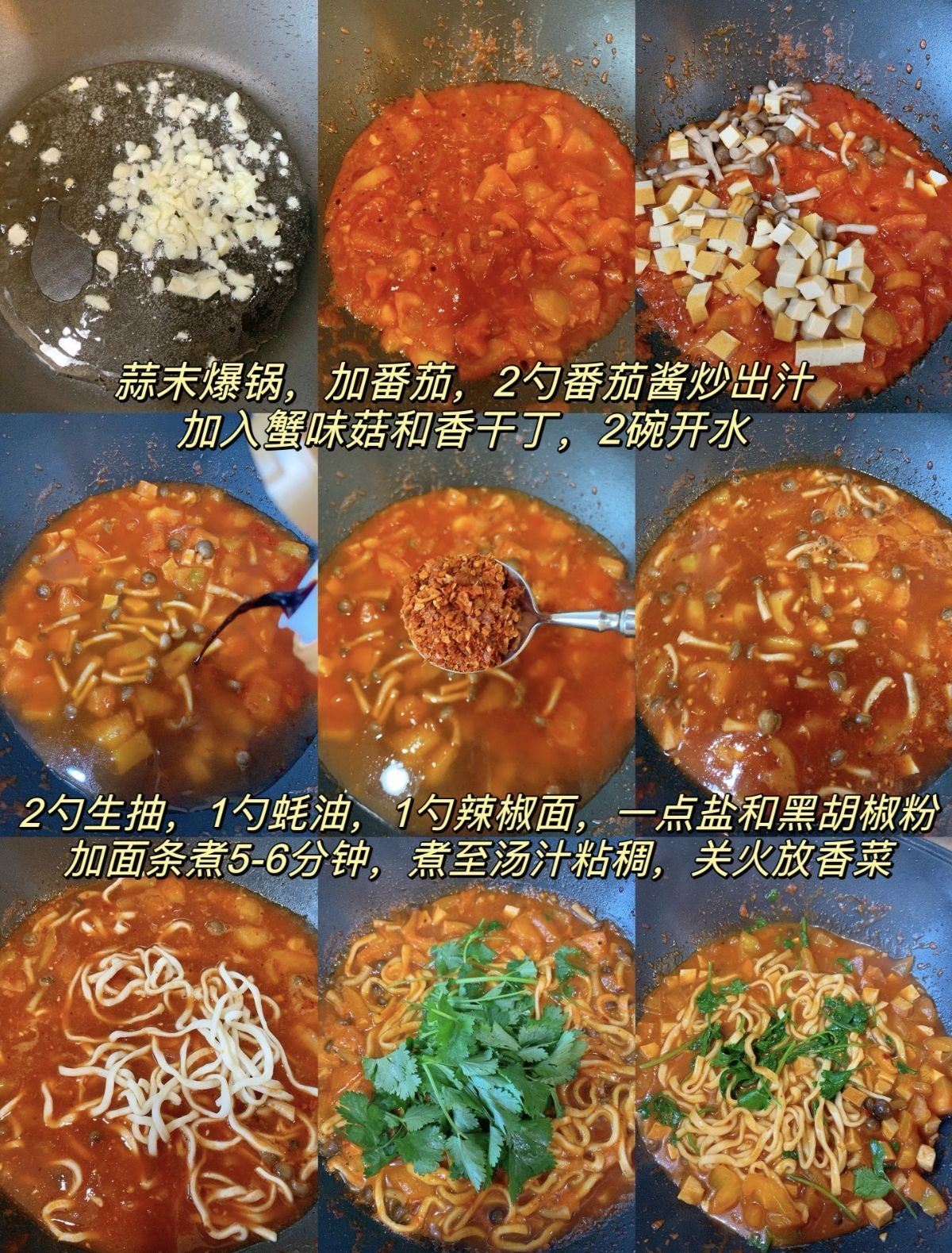 第二步,炒制汤底。锅中倒入适量的油,油热后放入葱姜蒜爆香,然后加入切好的香菇片,中火翻炒至香菇变软,释放出浓郁的菌菇香气。接着,放入切好的番茄块,继续翻炒。在炒制过程中,可以用铲子轻轻按压番茄,帮助其出汁。当番茄炒至软烂,汤汁浓郁时,加入适量的生抽、蚝油、盐和少许糖调味,翻炒均匀。